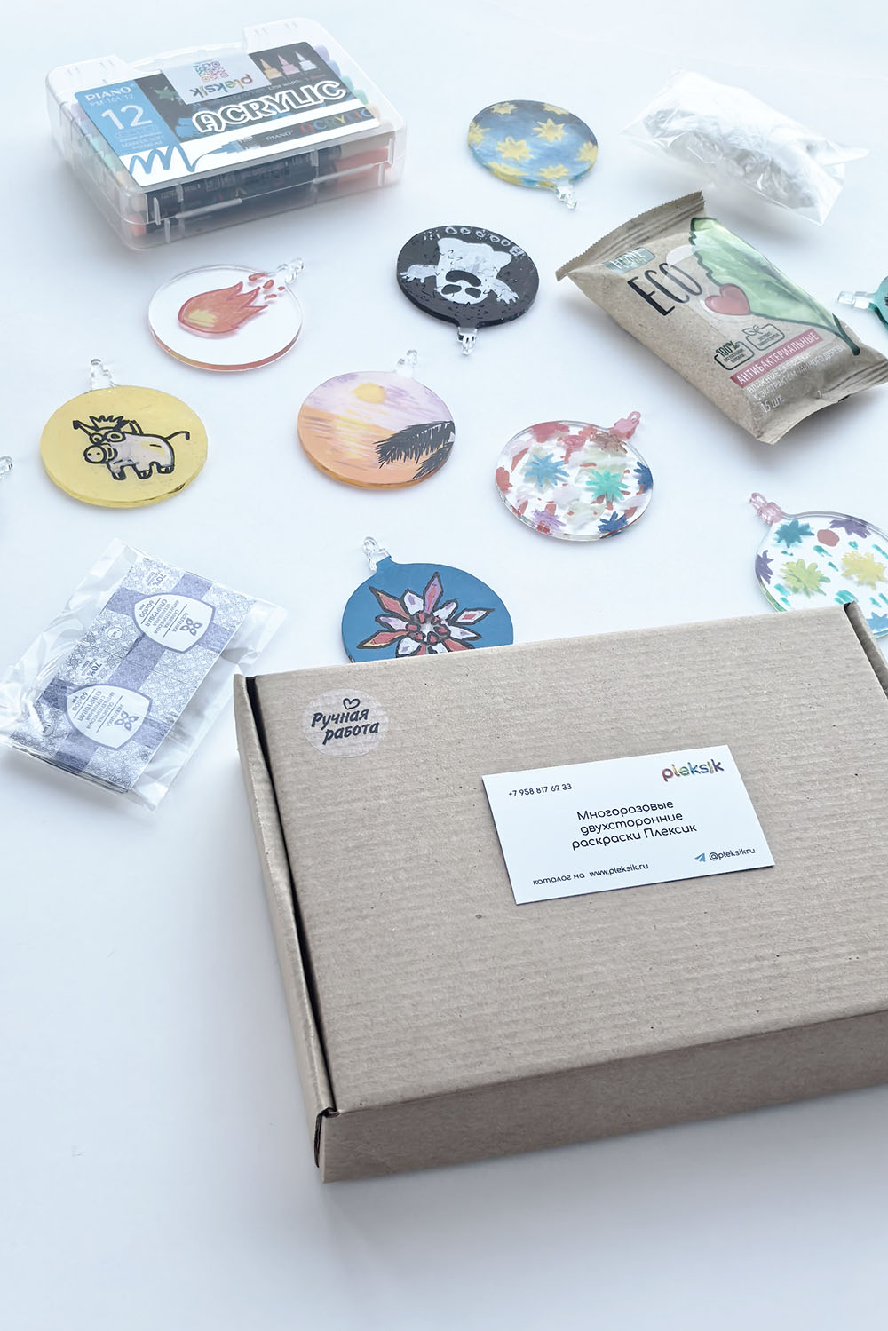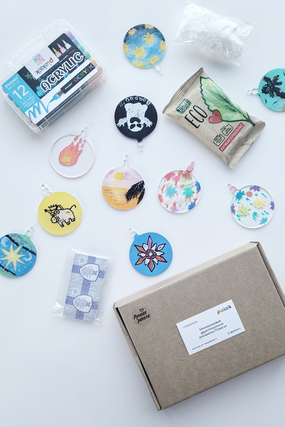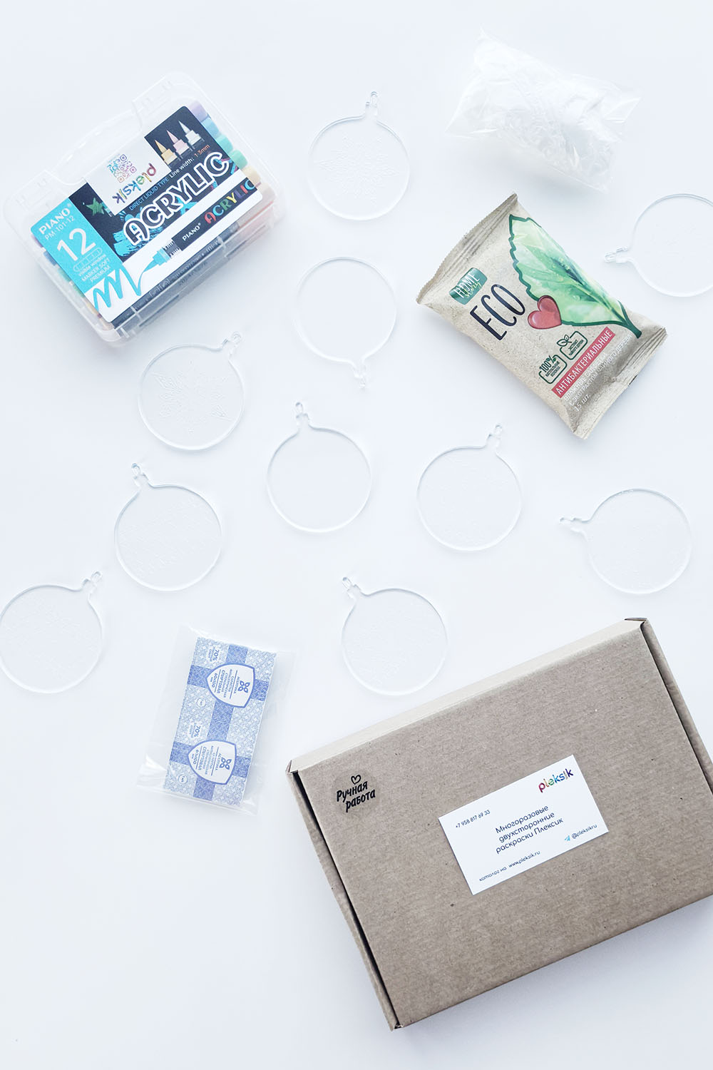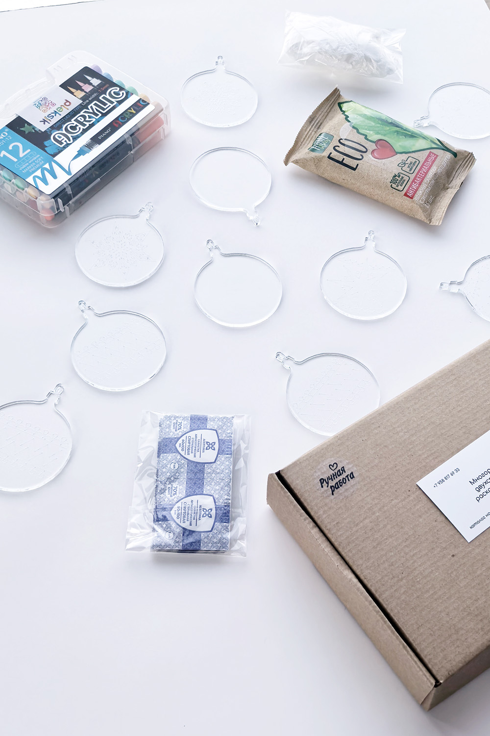 1. десять (10) любых ёлочных игрушек Плексиков, на ваш выбор, для раскраски с одной или двух сторон акриловыми маркерами;